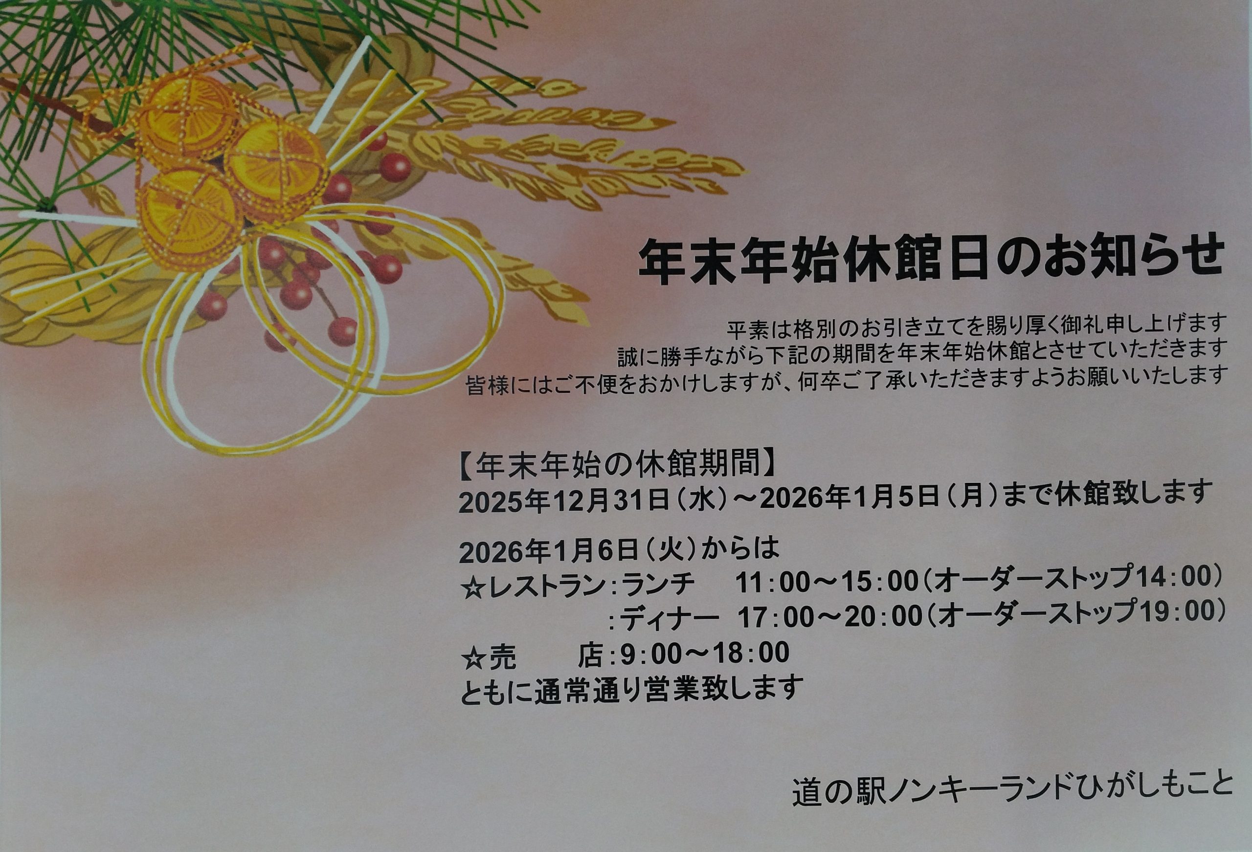 道の駅ノンキーランドひがしもことをご利用いただき、誠にありがとうございます。